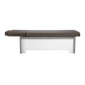 The treatment table is available in white and mocha upholstery colors as well as three wood finishes: natural walnut, terra walnut and concrete type.